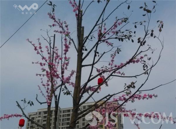 2月21日上午10时,笔者驱车沿翔宇大道骑行,在某售楼处外的路边,一眼就能看到路边多棵树木上桃花朵朵开,满树都是一片漂亮粉红色,可是当靠近却发现并无花香,上前细看一瞧才发现树上的桃花都是假的。