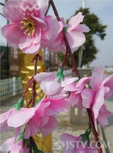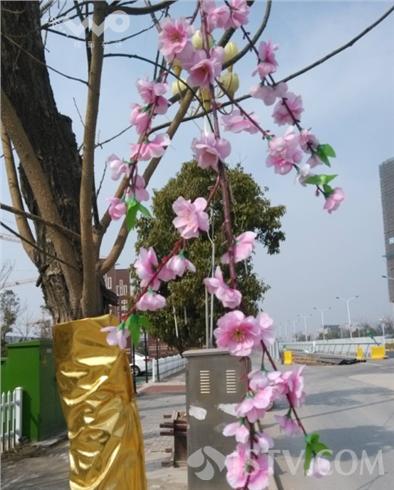 通过了解得知,这些桃花都是楼盘创意,将高仿桃花树枝系在景观树的树枝上,在风力的作用下,树枝晃动桃花也跟着晃动,也就让路过的市民产生了真桃花的感觉。
