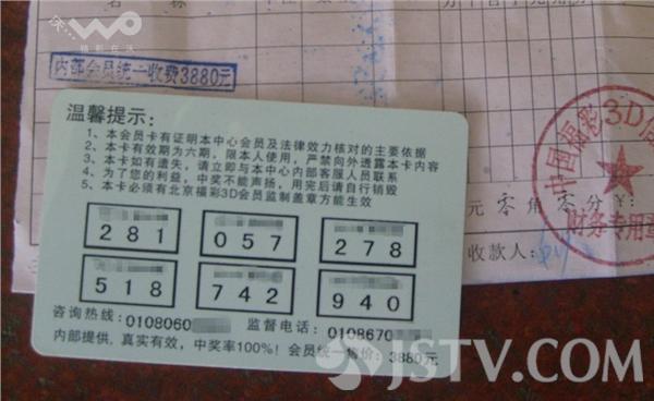 张先生称,这卡外形和信用卡一般大小,这张卡装在一个卡套里,还附着一张专用发票印上专用章,最让人迷惑的是,卡片反面有5条温馨提示和6组中奖号码。6组号码都是近期六个开奖号,一个数字都不差。