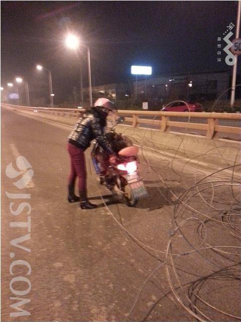 21日晚上8点多,记者在312国道,南京市区向龙潭方向的高架桥上看到,一团团钢筋散落在桥面上,占据了右边一股车道,绵延了五六十米。