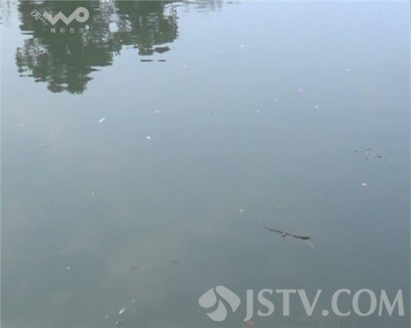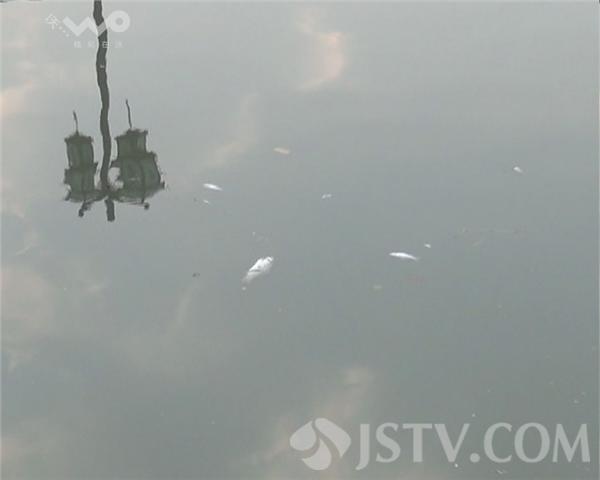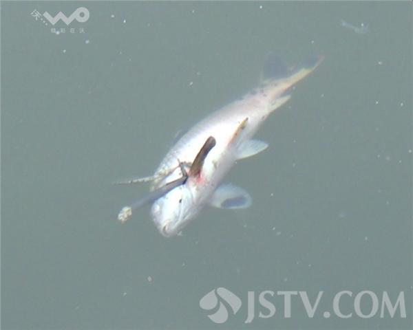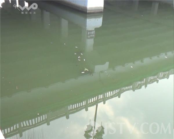 记者来到解放桥古运河,发现河边漂浮着大片死鱼,河水看起来也比较浑浊,漂浮的死鱼有的有一手叉长,有的和筷子差不多长,水鸟不停的水上盘旋,然后下水啄食奄奄一息的鱼儿。