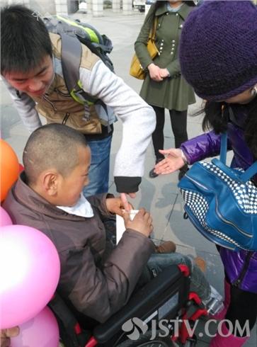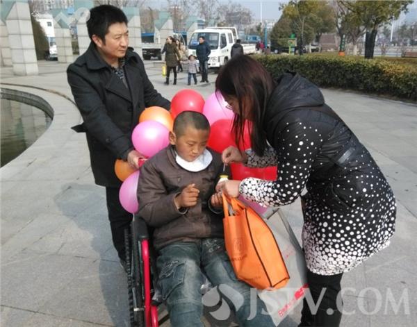 2月23日上午10点,淮安市楚秀园来了一群特殊的“客人”,9岁王朝晖和7岁王朝煜,兄弟俩在二十多名志愿者搀扶下,亲近大自然过了一次特殊生日,圆了两名脑瘫儿童小梦想。