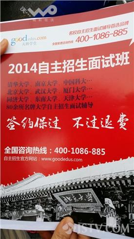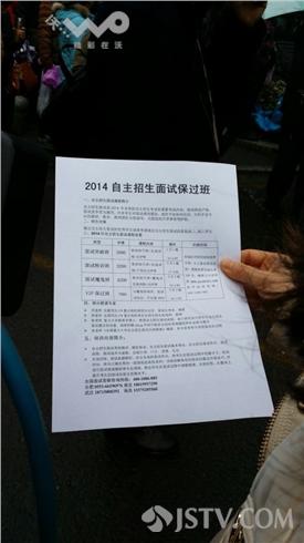 南京电大新街口校区作为华约联盟考场,今天从上午9点到12点,考生在考场里应考,家长在校门口等候,一些培训机构工作人员也没闲着,不停地发着广告宣传单,一家自称总部设在安徽的培训机构广告单页上写着,“2014自主招生面试保过班”。四种类型的班可供选择,价格在2000——7980元不等,最便宜的是“面试突破班”,10个小时,介绍面试技巧和实战训练,最贵的是“VIP保过班”,课时24小时,介绍面试技巧和魔鬼式实战训练,还将签订保过协议,不过的话会退还部分学费。