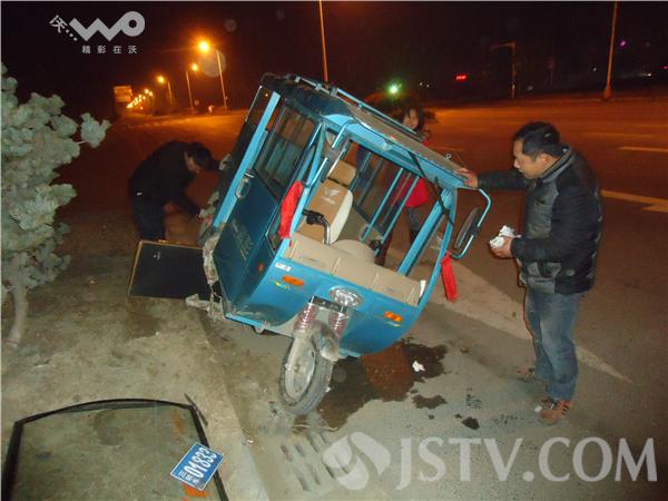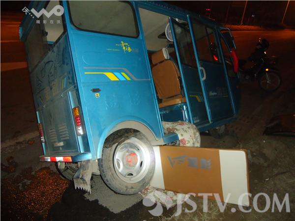 今晚10点40左右,在淮安区翔宇大道罗桥新区路口,一位下关村的村民去亲戚家喝酒,开电动三轮车回家时,碰到一群放学回家的学生,因避让不及,三轮车侧翻在地,前挡风玻璃摔掉落、车牌脱落、车轮毂撞到路牙上损坏变形,加之酒劲上来,混身没劲,无法回家了。