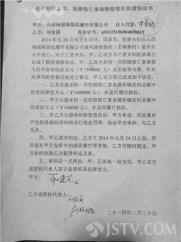 2014年2月20日,鸿福海烟花爆竹有限公司与爆竹经销商刘良国老板共同签署了赔偿担保,从担保合同中可以看出,鸿福海烟花爆竹有限公司与经销商刘良国共同一次性赔偿亡者亲属人民币一百伍拾万元,其中乙方刘良国一次性赔偿亡者亲属人民币一百肆拾万元,甲方鸿福海烟花爆竹有限公司一次性赔偿亡者亲属人民币壹拾万元。截至到目前,经销商刘良国已将20万元赔偿金按时赔偿给了死者家属,继而提出了要用爆竹抵余下的120万元赔偿金的想法。这一提议被死者家属明确拒绝。