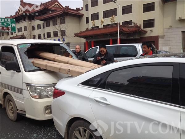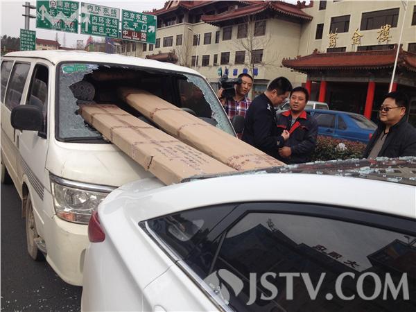 李先生下车后才知道,他踩刹车的时候,后面一辆面包车也踩了刹车,可是因为惯性,面包车的两捆装修材料飞了出去,结结实实地砸在了他的车上。