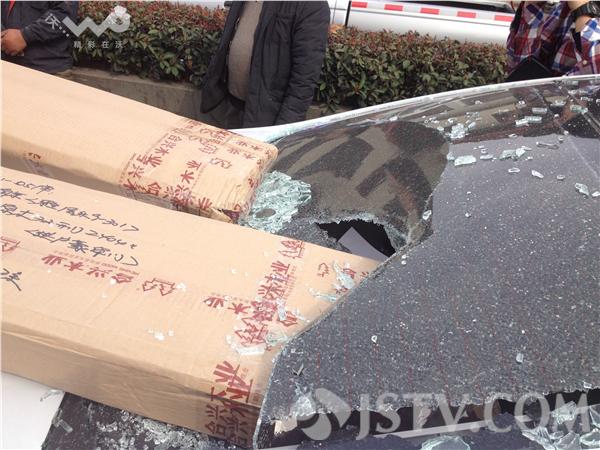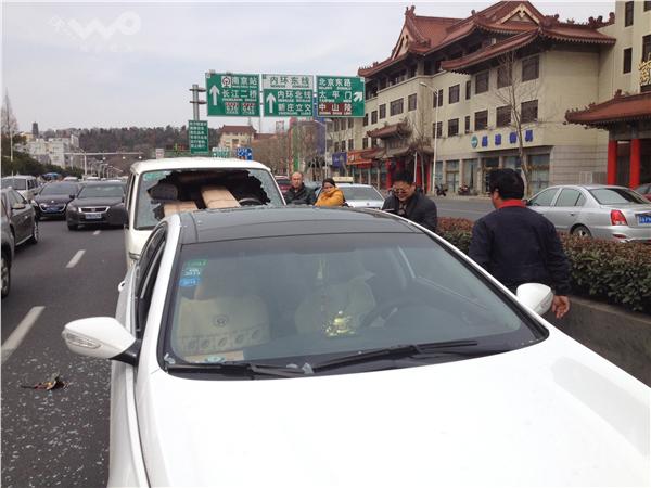 最前面的现代轿车司机李先生说,当时车子正常行驶,前方突然有一辆车子变道,他急忙减速,本以为没什么大碍,可没想到两三秒后,车子的后挡风玻璃被砸出了一个大洞。