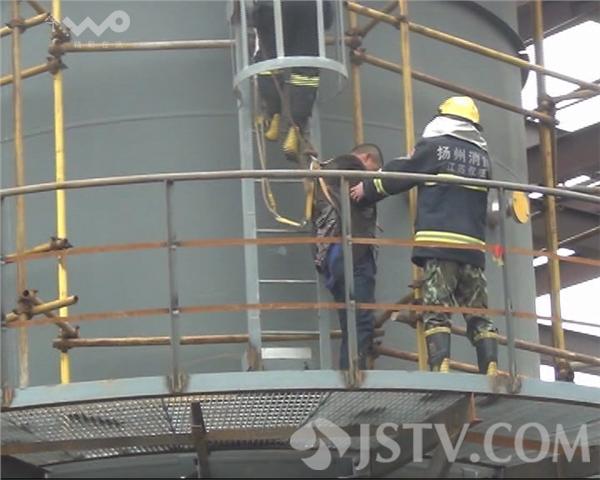 3月24日下午1点30分左右,一名男子酒后爬上位于扬州市化工园一家企业工地30多米高的高塔上,讨要工钱,躺在围栏边缘不肯下来,谁知酒喝多了,人下不来了。所幸工友和消防官兵及时将他解救下来。