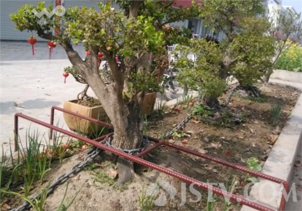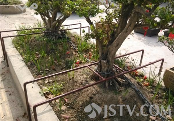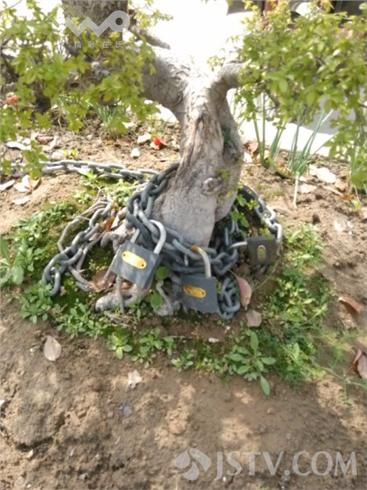 现场看到盆景四枝粗壮根系发达,有近一米高,铁链上被挂8把大锁,仅此一株就有4个铁锁,主人似乎不放心又在东侧两株盆景旁焊上铁架,防盗工作可谓细致入微。