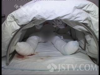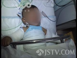 南医大二附院 医生 蔡薇:送来的时候,整个小孩基本上是嗜睡的状态, 精神非常的不好,叫也不怎么叫的醒。来的时候我们觉得已经达到了休克的情况了,他目前的诊断是全身面积是达到了39%(烫伤),全部是深二度创面,有一部分可能更深一点,生命很危险。到目前为止还没有脱离危险期,还没有度过休克期。