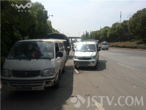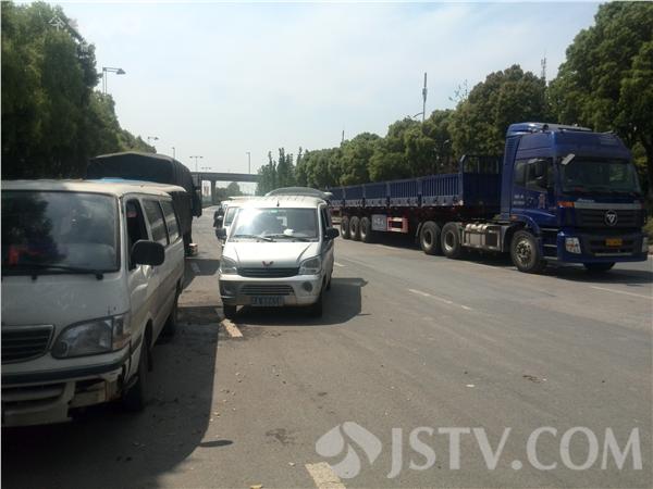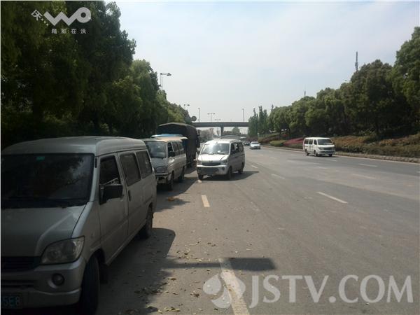 今天中午11点半,记者驱车路过南京扬子江大道,在道路的西侧、由南向北方向、靠近清凉门大街路口的地方,看到大路一侧停着10多辆汽车,有面包车,有货车。路上站着许多人。