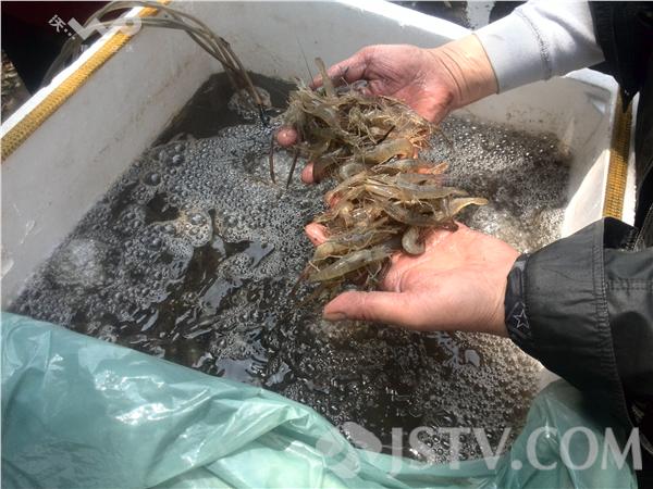 有一个人卖的是虾子,记者让他捞一些出来看看,他手捧着一些虾子,给记者看。活蹦乱跳的。