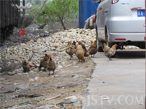 现场发现成群鸡在火车道旁的草丛里吃草籽、吃虫子,也吃货车上散落的粮食,可悠闲呢。 看着几十只鸡自由地“散步”,每走几步就能看见地面上的鸡粪。在老站北侧货仓铁道上,一塌糊涂,成群的鸡在轨道上散步,垃圾布满轨道,看着让人犯呕。
