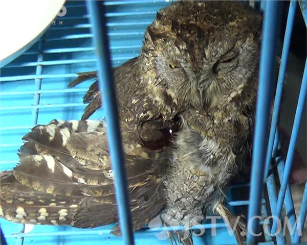记者来到梁女士家,为了不让小猫头鹰不受猫狗干扰,特地把猫头鹰放在宠物笼里,由于比较少见许多村民争相观看,自己观察发现猫头鹰一只翅膀部有血迹,大家怀疑该猫头鹰翅膀受伤无法起飞了,据梁女士介绍:当时她在自己门口闲逛时,发现门口一棵桃树上站着一只鸟,仔细辨认发现是一只小猫头鹰,随后用了手机拍摄几张照片,那知道小猫头鹰过了会从树上掉了下来,发现翅膀还在流血,就抓回家暂时收养了,大家也不知道猫头鹰吃什么,就用米饭和肉喂食,可是猫头鹰就是不吃,当大家用手向逗它时,猫头鹰就发出怪声,还用凶猛双眼注视。目前由于小猫头鹰翅膀受伤,暂时也不能飞,梁女士一家只好先收养家里,希望有专业人士能够及时提供治疗,让小猫头鹰重新回归自然。