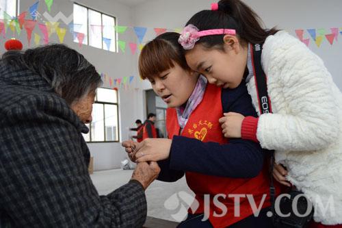 一来到敬老院,义工们就根据各自的特长,为老人们检查身体、测量血压、修剪指甲和理发。编号为155号的义工吴小妹就带着女儿为一名老奶奶一边修剪手指甲,一边与其聊天,她的女儿则在一旁看着妈妈帮老奶奶修剪。而当吴小妹要为老人修剪脚指甲时,老人却显得不好意思了。在为一名拄拐杖的老爹爹修剪脚指甲时,因为是坐在长条凳子上,老爹爹的背后没有依靠,吴小妹的女儿就主动跑到老爹爹的后面,做起老爹爹的“靠山”,而吴小妹则蹲下身子,埋头为老爹爹修剪脚指甲。修好老爹爹的脚指甲,吴小妹又来到一名老奶奶的面前,为她修剪脚指甲,但由于老奶奶的腿没办法抬高,吴小妹就单膝跪在地上,把老奶奶的脚抱在怀里,慢慢修剪。吴小妹的这一举动,让在场的老人们感动不已。