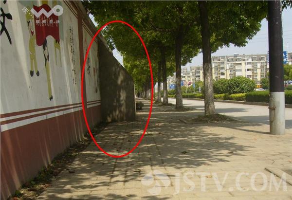 现场看到,“阻拦”盲道的是三堵水泥墙,沿着路边围墙一侧伸出来,看来除了能阻拦盲道正常通行之外,该墙似乎并没有其它用处,水泥墙和围墙之间合围的区域并没有开门或做其它用场。在盲道和围墙之间还有一口丢了井盖的窨井,临时用木托盘遮挡着。