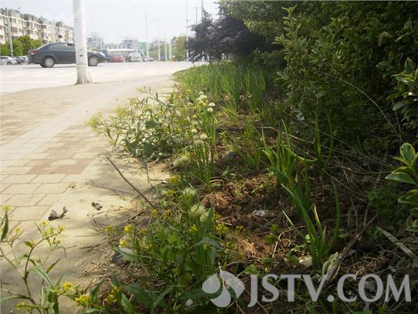 在南京仙鹤门地带,在邻近地铁出口的一马路上,路边绿化带里的树木大片遭毁,一些绿化带里甚至都已经没有了绿化灌木,被人种上了青菜、菠菜、洋葱、马铃薯等各种时令蔬菜,马路两侧随处可见成片的菜园“风景”,已“不愧为”城东地区的菜园一条街。