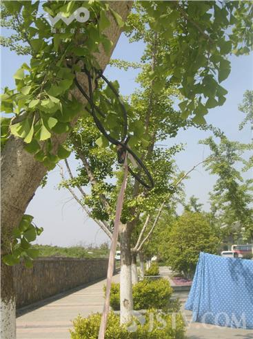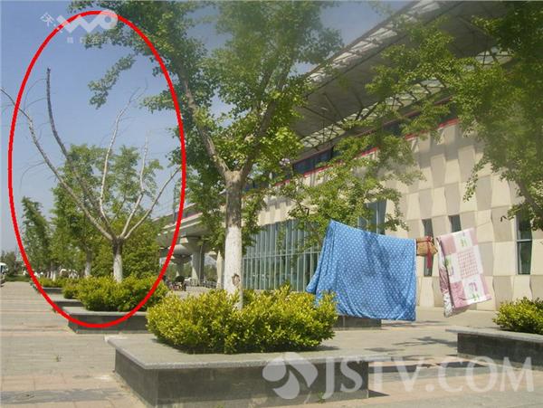 由于紧邻地铁出口,乘客出站时也要“途经此地”。现场发现,除了被晾晒的银杏树上系有绳子,相邻的其它银杏树树干上也缠有电缆绳。旁边甚至有一棵银杏树已出现了死亡。据在广场上聊天的姑娘们说,这里天气晴好时天天都有人晒被子,那棵已经死亡的银杏多半是晾晒被子时被拉绳拉死的。