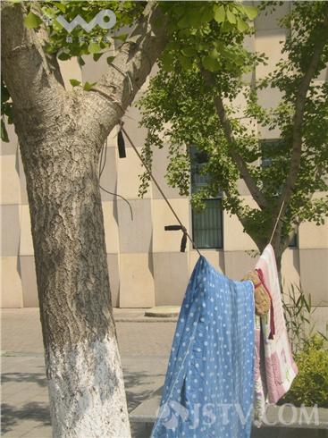笔者今天上午乘坐地铁去南京东郊,在经天路站前广场上发现竟有人公然在此晾晒被子,两床被子晾晒在一根两头系在银杏树的一根绳子上,从地铁上往下一眼就能看见,景象十分不雅。