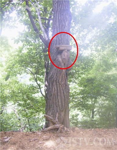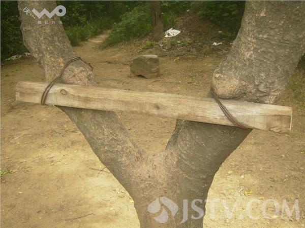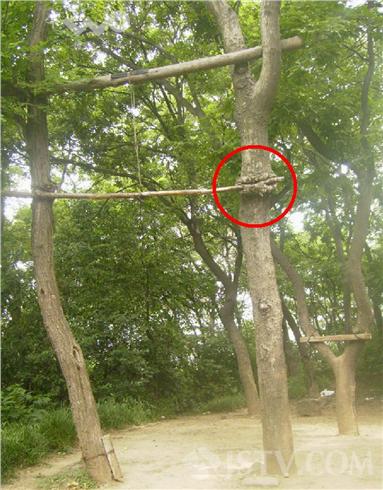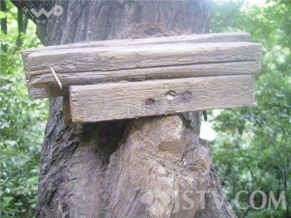 沿台阶拾级而上,之前沿路所见的几处树木上钉钉子、绑铁皮的情况确实少了一些,有的禁锢甚至完全消失了。但是令人意外的是,新的问题又出现了。在原来去除禁锢、绑架的地方,又开始有人架上木棍、钉上木板做成“简易”健身器材了,更有甚者,竟然有人在树干中部砍凿,被砍的伤疤还十分新鲜。