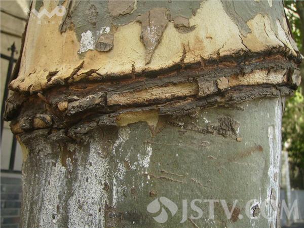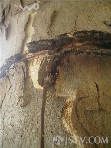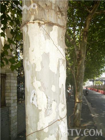 在南京秦淮区晨光巷,路边多棵法桐铁丝缠身,一些铁丝由于年常日久都已经“长”进了法桐身体,伤痕累累,让人看后十分心痛。