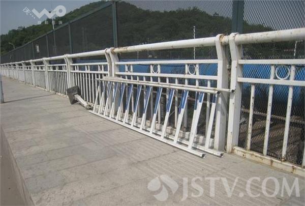 记者在现场看到,天桥上南北两侧的隔离护栏仅南侧完好,而北侧隔离护栏出现了一个大缺口,被人为拆除的两只护栏和一只基桩静静地依靠在天桥栏杆边。