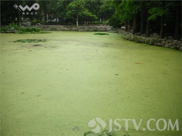 南京和平公园里有个清澈的水塘,长年碧波荡漾,环境十分优雅,是附近市民的休闲好去处。然而令人意外的是,近来整个水面上长满了浮萍绿藻,原本清澈的湖面已变身为一处标准的“绿茵场”了。