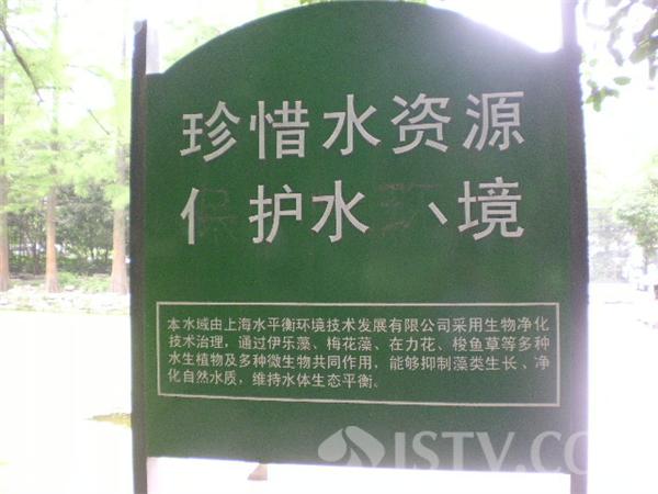更具讽刺意味的是,在水塘边上还竖立有一块牌子,标明“本水域由上海某某公司采用生物净化技术治理,通过*******等,抑制藻类生长,净化自然水质,维持水体生态平衡”。