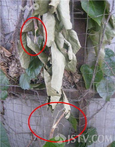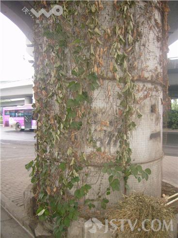 立体绿化是城市的靓丽风景,也是南京近来兴起并逐渐增多的独特城市景观,那点缀在钢筋水泥间的一柱柱绿色,似乎给“行进中”的城市增添了无限的活力。然而,在城北新庄立交高架下,却有一柱立体绿化惨遭人为破坏,在靠近爬山虎根部,有多处藤茎遭人折断。被折断后的爬山虎,上端大片枯死,下端仍鲜绿活着,上下两端对比十分鲜明。整个立柱上叶子大片枯萎的景象十分凄惨。
