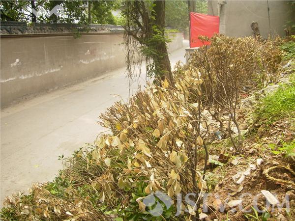 在南京栖霞区幕府东路北侧,通往窑上村的一条马路边,新移栽不久的灌木已大片枯死,现场一片死气沉沉的景象。