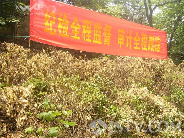 就在枯死灌木上方,却悬挂有两条鲜红夺目的宣传横幅标语,“鼓励”附近居民趁早搬家动迁。
