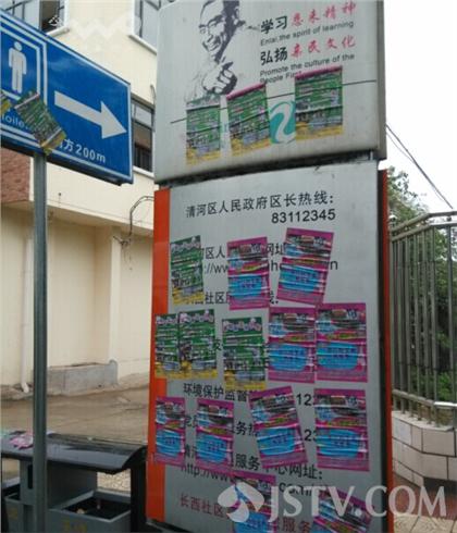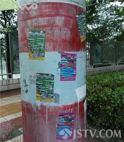 一路上看到所有垃圾桶、电线杆、站台、路牌、广告牌等公共设施全被贴满小广告,小广告内容都一样,全是孩子暑假舞蹈培训班广告,有的告示牌上被贴满了20多张。