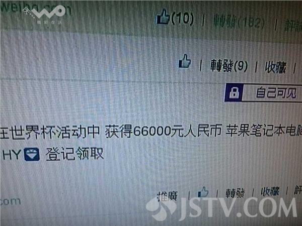 这段时间,可以说是球迷们的“专属时期”。最近,家住南京市浦口区的周女士,也“跟风”世界杯,在新浪微博中玩了一个叫“微博足球”的游戏,但让她意想不到的是,游戏刚一结束,就有人通知她:你“中奖”啦!