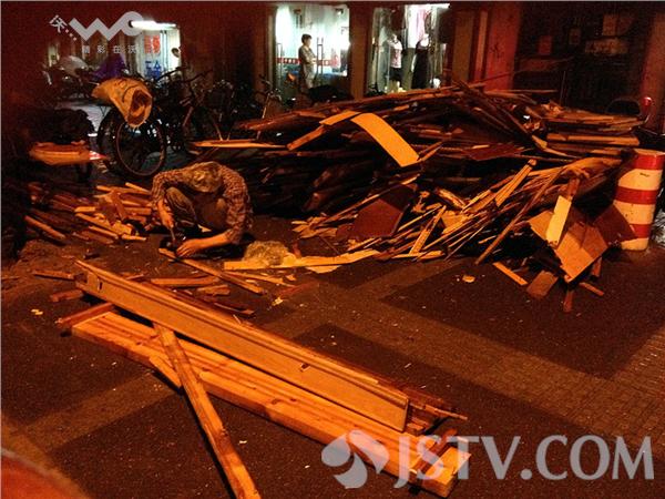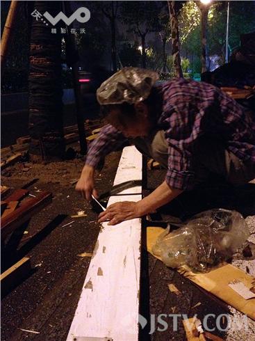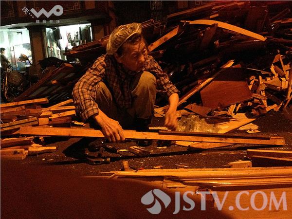 昨晚上9时许,天已漆黑,小雨下个不停,在南京鼓楼区水佐岗菜场门前的路灯下,一位70多岁的老奶奶,头戴塑料防雨帽,身上湿漉漉,右手拿起拔丁鎯头,蹲在一大堆废木头旁,尽情的敲打别人丢弃的一大堆木头,老人把废木头慢慢分拣,方方正正毫无破损的放一堆,圆柱形的梁柱子放一堆,剩下乱七八糟的小板材放一堆,板子里拔出的丁子、铰链等废铁放进布袋里。