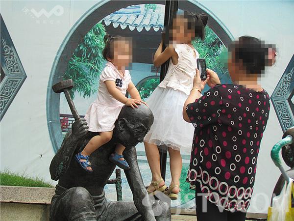 位于老门东雕塑是老南京的一处文化景点。然而,游客肆意践踏景点雕塑,甚至爬坐在脖子上拍照留影,让人遗憾。6月30日,笔者在南京老门东看到不和谐的一幕,一位奶奶带着2孙女,不停来回坐在铜雕脖子上拍照,姐姐自己爬,小的奶奶抱,实在有欠文明。