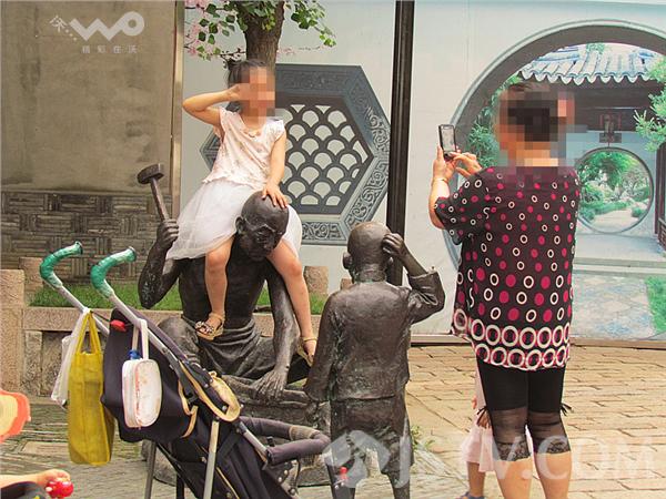 6月30日下午14时许,看到南京老门东游客往来,其中很多人站在一组“箍桶匠”雕塑前拍照留念,但一位奶奶在雕塑前为孙女拍照觉得不过瘾,索性将小孙女抱坐在脖子上,摆出各种姿势为其拍照。