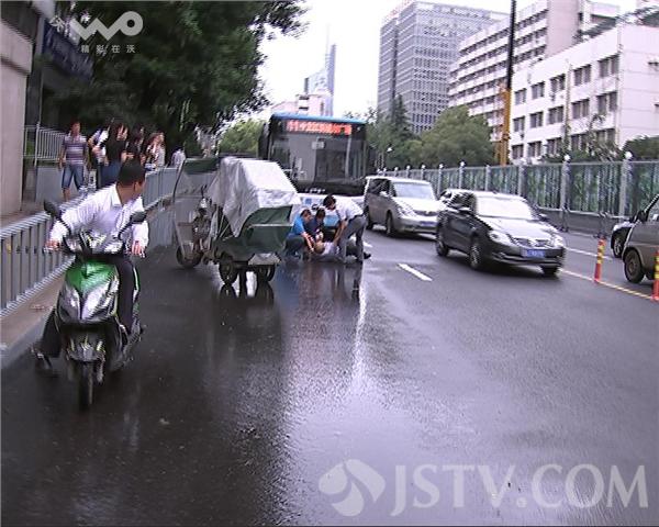 今天中午11点半左右,市民张先生骑着三轮车经过北京西路南京大学路口时,没在意路中央的一个大坑,人一下子从车上飞了出来摔倒在地。张先生腿脚不方便,倒在地上起不来,眼看自己的三轮车就要撞到自己,这时路过此地的几位热心市民赶紧过来扶住他的车子,并把从地上扶起来。而就在好心人在帮助张先生的时候,一辆警车从他们边上擦肩而过,车速不快,但是并没有停下来伸出援手。张先生说,非常感谢这几位市民,热心肠的人还是有的,那种跌倒不扶的现象毕竟只是少数。而就在好心人在帮助张先生的时候,一辆警车从他们边上擦肩而过,车速不快,但是并没有停下来伸出援手。记者的镜头记录了这一瞬间,或许这辆警车是在执行紧急公务吧?