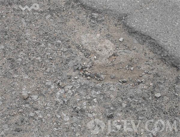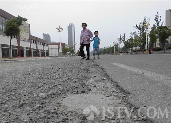 现场看到这条“双面路”位于富士康路上,路面破损路段长约1000多米,笔者骑车在路上感觉非常颠簸,下车用手稍微抓了一把都是石头子,路面破损非常严重,而在破损路旁的路面却有着天壤之别,一条路上竟有两种不同路面,许多市民骑着自行车不得不与机动车一起行驶在路中间。
