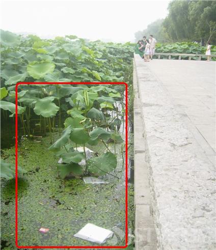 时值盛夏时节,荷叶满池,荷花盛开,玄武湖公园每天吸引了大批市民前去休闲、赏荷、纳凉,湖边荷花池因此也再度成为一些市民随手丢弃垃圾的“场所”。这不,只需沿着湖畔走一圈,你就能发现多处湖面荷叶上有人丢弃的西瓜皮、烟头、饮料瓶、报纸等,尤其在湖边凉亭和湖上桥下,更是垃圾成灾。市民赏荷之余,随后丢下的各种垃圾漂浮在荷花荷叶丛中,无疑已成大美荷花池中一处扎眼的污点。