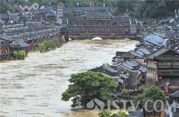 受暴雨影响,凤凰古城境内的沱江水位猛涨,出现严重内涝,导致古城内全城停电、景区关闭。