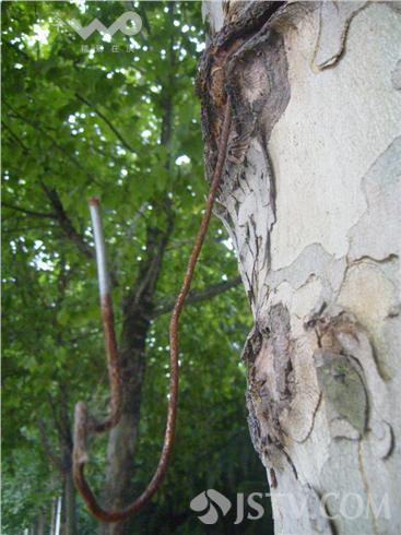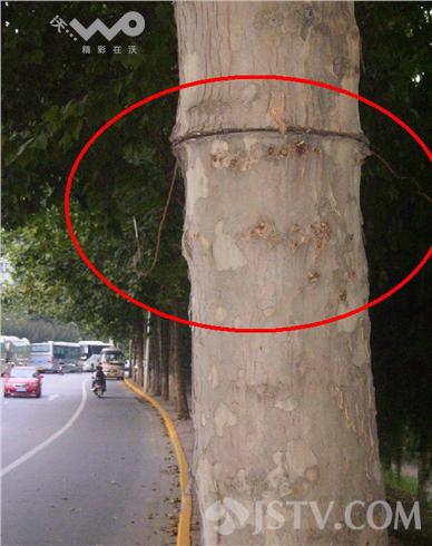 在南京光华门西路上,路边一棵棵大树惨遭铁丝勒索,勒进树干的铁丝最后只留了一端或两端铁丝露在外面,仿佛成一棵棵“脐带”树,让很多经过市民看后很觉受伤。