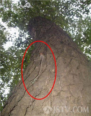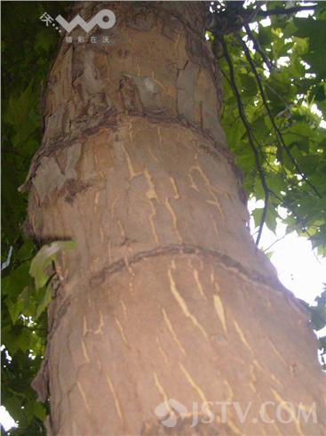 遭勒索的大树以法桐为主,间有一两颗体形硕大的枫杨,笔者沿路仔细查看了一下,遭如此待遇的大树总计约有十多棵。由于年代较久,那些原先只是缠绕在树干上的铁丝大多已深深地长进了树干,树干上因此形成一圈圈醒目的伤痕。据附近居民说,这些铁丝长进树干都有好多年了,现在已难以取出。