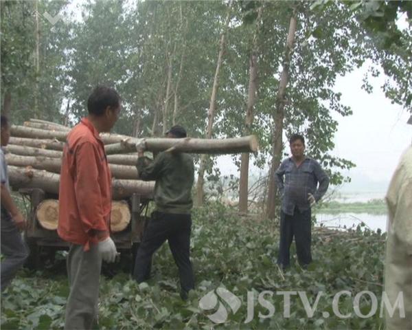 砍伐地点位于六合四柳河北侧,四柳河属于滁河的一条支流,当记者赶到现场时,二十多棵大杨树已经被砍倒在地、分割好准备运走,记者一边拨打报警电话,一边与当地村民一起将拖树的车子拦下。
