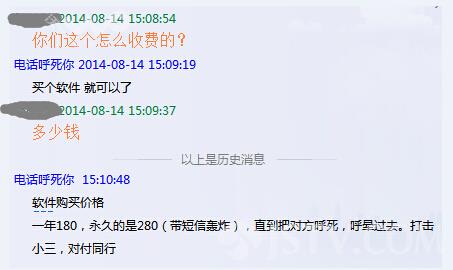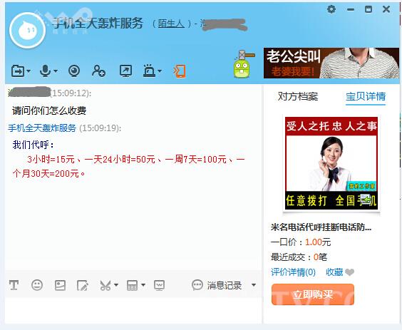 随后记者在淘宝上搜索,输入“电话骚扰代呼”、“电话骚扰轰炸”字样,随即出现结果,其中一家店铺甚至广告语是“受人之托 忠人之事”,表示可以任意拨打全国手机。咨询了解道,有两种付费方式,一种是对方直接帮你拨打,根据你要骚扰的时长,不同收费标准;另一种是直接购买软件,有一年和永久两种方式,价格也不同。