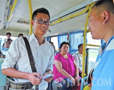成子樑是632路公交巡检员,从8月18号开始,他在车上巡检时,看到主动让座的乘客都会上前发放一张爱心卡片,得到爱心卡片的乘客可以免费乘坐一次公交。今天上午九点半,这位中年乘客第一个起身让座,获得了爱心卡。
