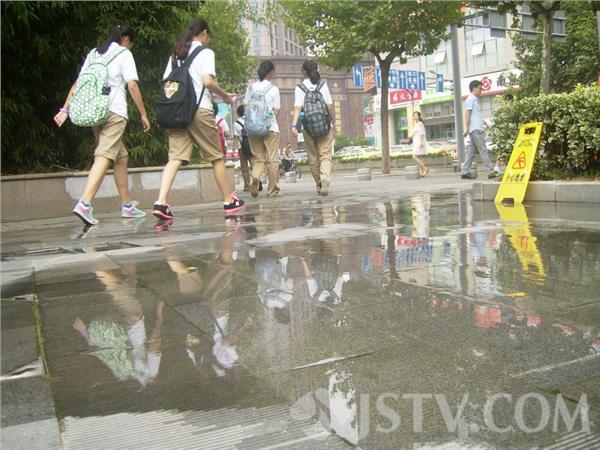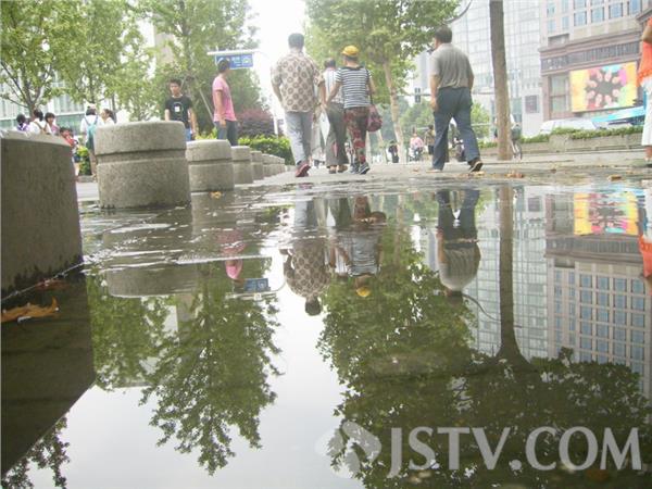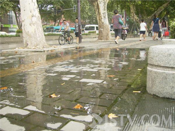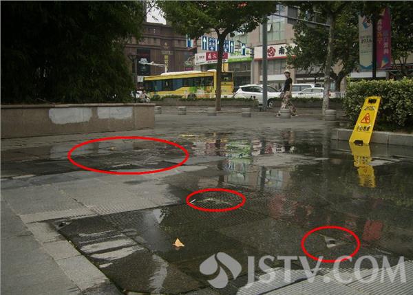 近日,有市民经过南京中山东路大行宫附近时,发现人行道上积水严重,行人经过不得不淌水而过。根据指引,笔者来到现场发现,水源来自人行道边一侧广场,广场中间的两处窨井正源源不断地往外冒水,满溢出来的水已侵占了一大块地面,一直满溢到人行道以至慢车道上,行人经过确实犹如淌水过河。