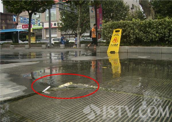 据附近青奥平安志愿者称,这里井下冒水已经很多天,一直未有人前来修复,疑似井下水管堵塞导致,井水满溢而出侵湿一大片地面,使经过此处的行人不得不绕道通行,由于人行道上积水最多,行人为此还不得不踮着脚绕道快速通行。笔者注意到,为防止脚下打滑摔倒,有人还在广 场花坛边特意放置了“小心地滑”字样的警示牌。