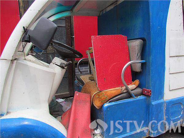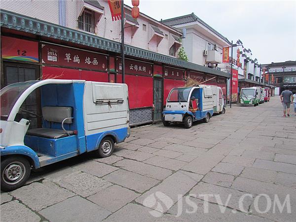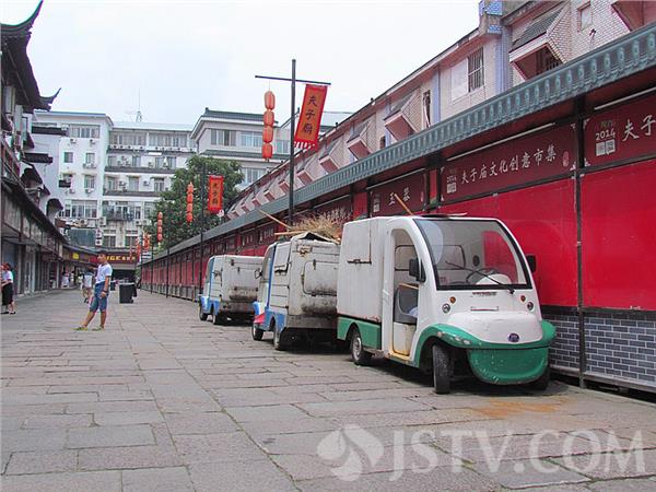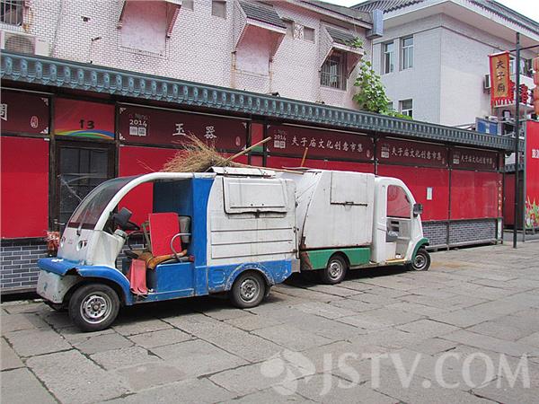 这6辆垃圾车,有3辆是好,还有3辆表面蒙上一层灰,看样子是有了很长时间,有的损坏,有的轮瘪了,有的驾驶台堆着木板等杂物,车顶上放着几个大扫把。附近商户说,这是夫子庙管理局的,停放在这里很久了,一直无过问。