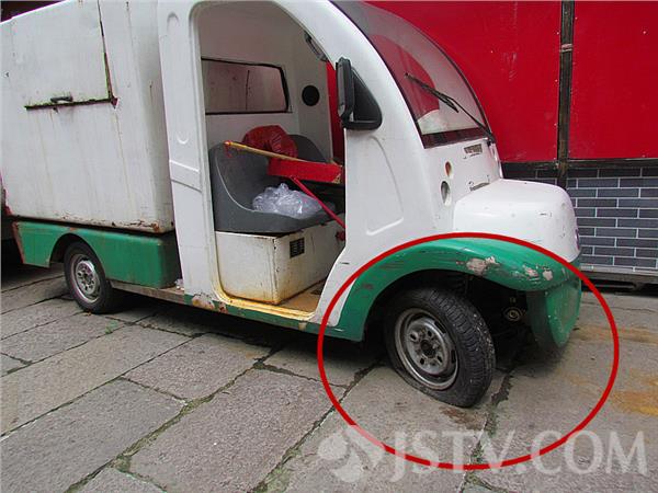 南京夫子庙贡院西街东侧,紧靠一排小市场门口,有6辆垃圾车停在店铺门口,3辆损坏,车身蒙上了厚厚的灰尘。该车的车头损坏,驾驶台堆着木板等杂物,还有一辆右前轮瘪了没有气,后箱板脏得不得了,车的扫把放在车顶上。采访中,附近商铺店主表示,这几辆垃圾车停放在这里很久,既不雅观也影响交通,希望有关部门尽快把垃圾车清走。
