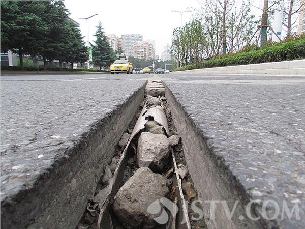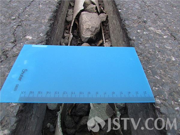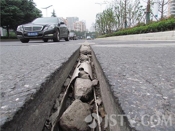 笔者在现场看到, 这条沟位于南京江东北路快车道上,沟内有一根破碎的PPC管子,管子内有不少水泥石块,沟壁切得非常整齐,沟深约12厘米、宽约17厘米、形成了一道长约2米的纵沟。不少过往车辆经过此处时,纷纷刹车减速,但仍有不少车辆的轮胎与沟糟边沿发生摩擦。出租车刘师傅称,这条沟正好距路口红绿灯百米远,司机在路口刚刚起步、换档、加油时,突然发现路中一条轮胎宽的沟,紧急制动,只听到后面车辆一个接一个刹车声,很容易发生交通事故。如果是摩托车车速快经过,也可能发生翻车等危险。附近居民称,这条道路是青奥会前才竣工,是一条快速内环,不知是何人用机器挖开一条“轮胎沟”又不及回填,存在安全隐患。希望相关部门能尽快将这条“轮胎沟”修复,恢复正常通行。